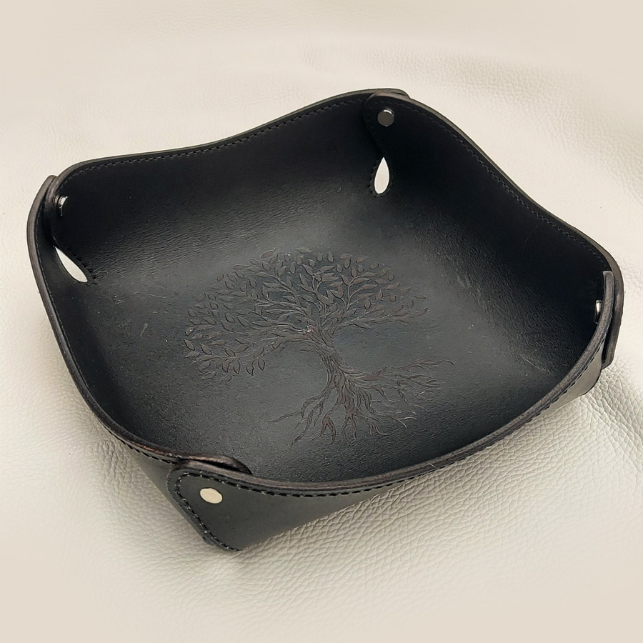 Tato elegantní kožená miska / úložný prostor je ideálním řešením pro ukládání vašich klíčů, peněz, brýlí nebo sladkostí. Vyrobeno z kvalitní černé kůže, tento výrobek je nejen praktický, ale také skvěle doplní interiér vašeho domova či kanceláře. S rozměry 24 x 24 cm je dostatečně prostorná pro vaše drobnosti. Navíc nabízíme možnost gravírování (vypalování) vašeho vlastního obrázku, což činí z této kožené misky perfektní personalizovaný dárek pro vaše blízké nebo jako unikátní doplněk pro vás.